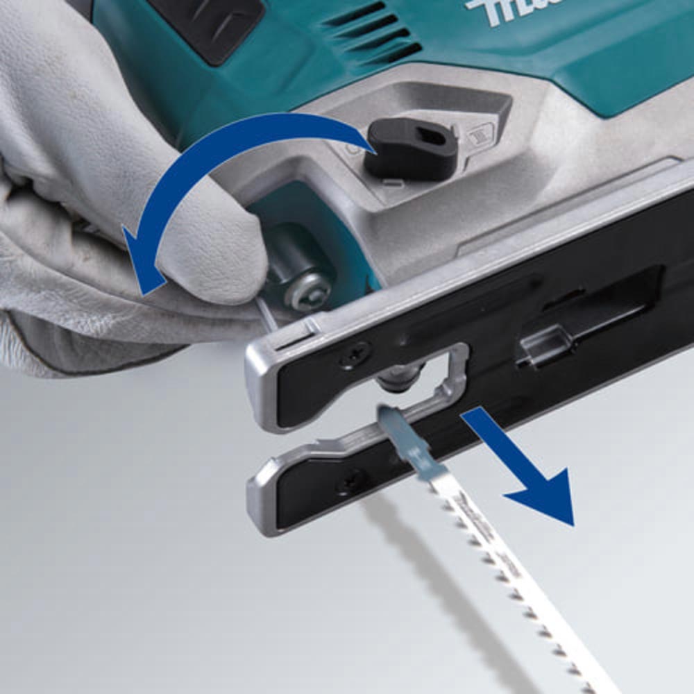 装着はブレードを差し込むだけ。クランプを回すとワンタッチで取り外せます。